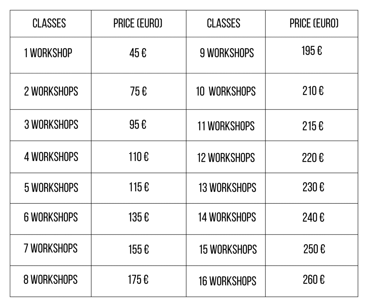 You can join the workshops with or without a partner. If you don’t have one, we’ll try to match you — but you’ll need to accept the partner we find.